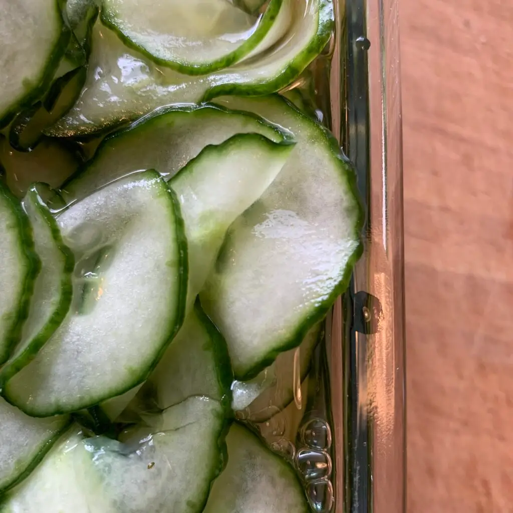 Snit agurkerne i tynde skiver og vend dem godt rundt i en skål sammen med saltet. Sæt skålen til side i minimum 15 minutter – gerne 1 time. Hæld eddike, sukker, vand, peberkorn, laurbærblad og en eventuel dusk op i en gryde. Kog lagen op så alt sukkeret er opløst. Tag gryden af og lad lagen køle af. Når agurkerne er klar, skal du hælde dem op i et dørslag og skylde dem med koldt vand. Lad dem dryppe af i dørslaget. Hæld agurkeskiverne op i en skål og hæld lagen over, når den er under 40 grader varm. Agurkesalaten kan spises straks eller efter 14 dage i køleren.