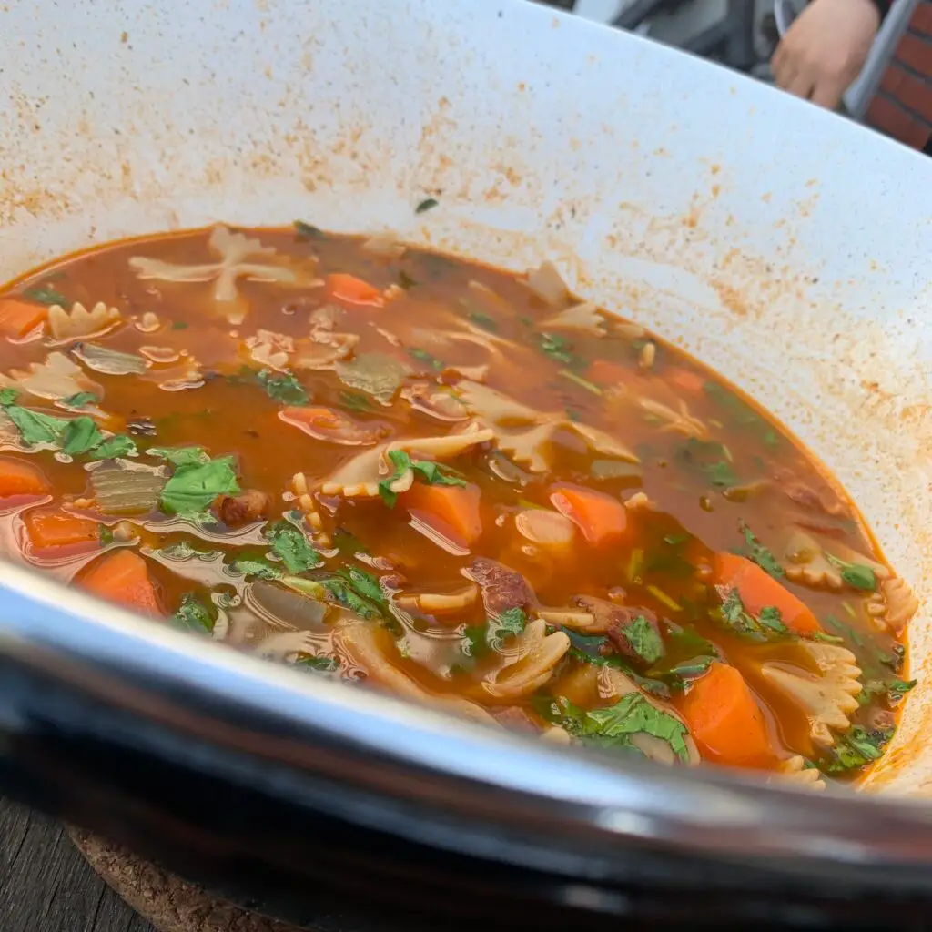 Tænd et bål! Bålgryde smager bedst, når den er lavet over bål, – med børn som bålchefer og lidt røg i øjnene. Skær din gode bacon ud i stykker og smid det ned i en varm gryde. Rør rundt og hold øje. Rens og skær dine andre grøntsager ud i de stykker, som ungerne formår. Når baconen har fået god farve og lidt stegeskorpe, tilsæt da dine grøntsager. Rør rundt og kom tomatpuré i. Lad det hele stege i et minuts tid, og kom så din hønsefond og vandet i. Kom låg på og kog op. Når gryden koger, smager du til med salt og peber. Herefter kommer du din pasta i og koger, til pastaen er al dente (det kan være nødvendigt at tilsætte lidt mere vand), smager til igen og tilsætter det hakkede basilikum. Bålgryden serveres brandvarm i spejderservice og spises med en ske eller det, der ligner, – og hvis du er heldig, så er der en godt grillet skumfidus til dessert…