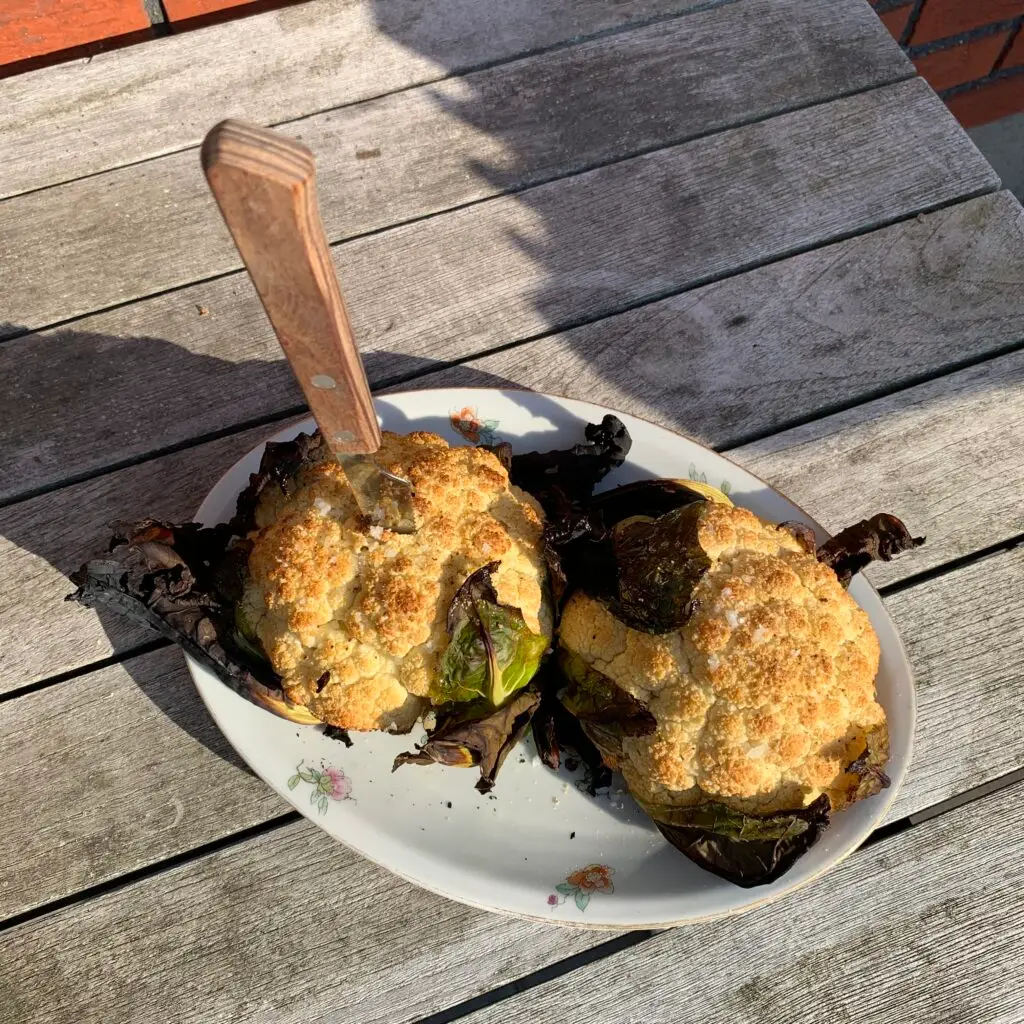 Tænd grillen. Vask blomkålen og lad alle bladene sidde på. Smid blomkålen på grillen og grill med indirekte varme. Og hvor længe skal det så have? En almindelig størrelse blomkål skal have ca. 30 minutter. Der er meget stor forskel på hvor hård varme, du kan grille med, og hvor stort et kål du arbejder med. Blomkålen skal have farve, og bladene bliver helt sikkert brændt. Du kan tjekke, om dit kål er færdigt, med en kniv, – jeg kan bedst lide, at der er noget sprødhed inde i midten. Når du er tilfreds, løfter du blomkålen over på et fad, overhælder med en lækker olivenolie og drysser med salt og peber.