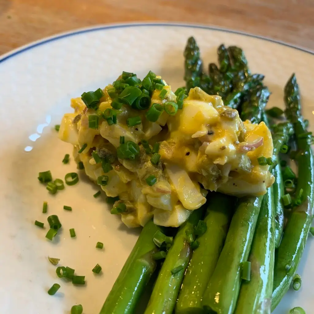 Sæt en gryde vand over på komfuret og godt med salt i vandet. Kom alt – undtagen asparges – op i en lille skål og rør rundt. Lad det stå lidt, smag og smag evt. til igen. Knæk det seje bundstykke af dine asparges. De knækker der, hvor de holder op med at være seje og trævlede, siges der – men man kan med fordel lige hjælpe lidt på vej og knække den lidt under der, hvor den selv vil – det er en skam at smide for meget ud…. Kom dine asparges op i det kogende vand og kog dem. Ikke for lidt og ikke for meget. Der er kæmpestor forskel på grønne asparges, men ca 2 min for de helt tynde og ca. 4 min for de helt tykke… I må selv mærke og knække jer lidt frem. Tag dine asparges op af vandet, når de er færdige og lad dem dryppe lidt af. Anret dem på fad eller tallerken, og kom generøse skefulde med vinæggrette og friskhakkede krydderurter på toppen. God til brunch, forret eller til at stille en seriøs lækkersult.