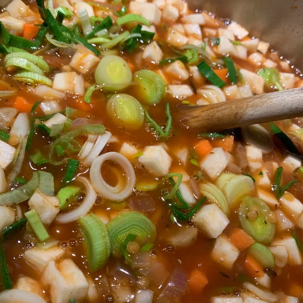 1,5 kg grøntsager i tern. Efter sæson – Selleri, gulerod, porre, peberfrugt fennikel, persillerod, squash osv….