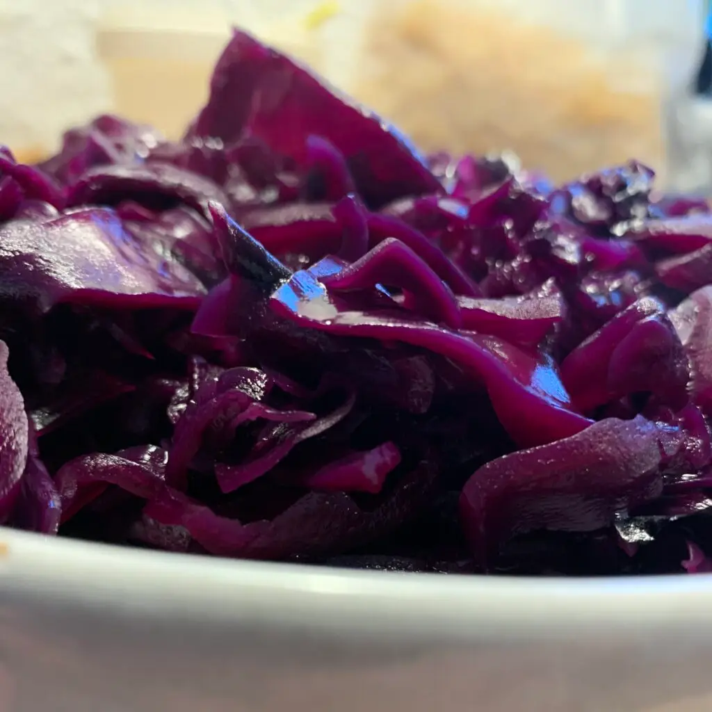Del din rødkål ud i kvarte og fjern stokken. Skær rødkålen i grove strimler – ca. 1 cm brede. Dump rødkålen op i en gryde og tilsæt resten af ingredienserne. Læg låg på din gryde og lad kålen koge op. Når kålen koger, så sæt låget på klem, så dampen kan forsvinde fra kålen. Kålen skal koge ca. 1,5 time i alt – og det skal justeres, i hvor høj grad der skal låg på, for det skal passe med, at der næsten ikke er noget væske tilbage efter kogningen. Hvis du er ved at koge tør, så kan du tilsætte lidt vand og fortsætte. Kålen skal være mør – men den skal ikke koges ud. Juster evt. smagen til sidst, hvis du tænker, der mangler noget syre eller sødme – rødkål er langtfra ens!