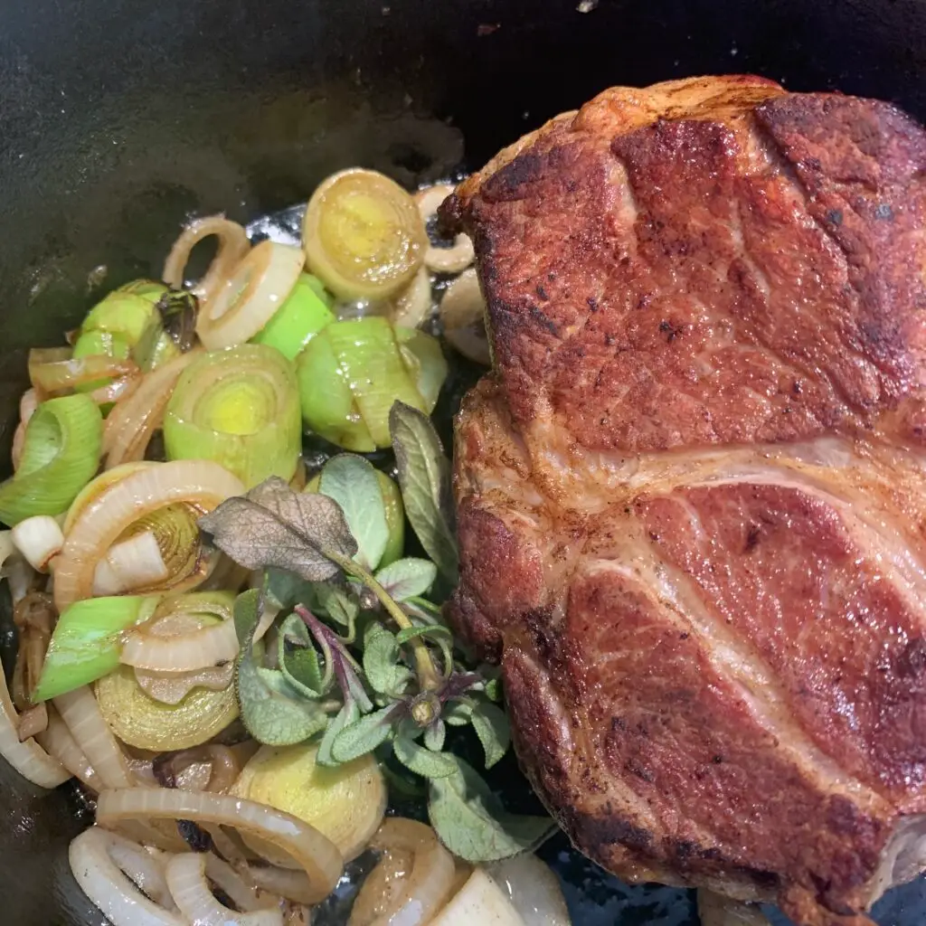 Brun dit kød af i en gryde på komfuret. Når du er glad, og din gris er brun og lækker, så skal du tilsætte dine løg, som du har skåret i ringe. Lad løgene stege sammen med grisen i ca. 5 minutter. Tilsæt salvie, eddike og vand. Sæt låg på gryden og hele herligheden sættes ind i din ovn på 160 grader i 1 time og 45 minutter. Kig til grisen en gang i mellem og tilsæt evt lidt mere vand, hvis det er nødvendigt. Der skal hele tiden være lidt væske i bunden af gryden. Mens du venter på grisen, kan du skrælle dine kartofler og skære dem ud i grove skiver af ca. 2 cm. Når der er gået 1 time og 45 minutter, så skal du tilsætte dine kartofler, drysse med salt og peber og sætte gryden tilbage i ovnen – nu fyldt med kartofler og kød. Kartoflerne skal være i ovnen, til de er møre, og til de har suget al den lækre sky fra kødet op – det tager ca. en time, og så har du en færdig gryde – fyldt med smaskforkælet gris!