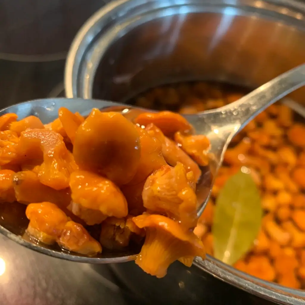 Kantarellerne vaskes forsigtigt i flere omgange med koldt vand og sættes til side i et dørslag til afdrypning, når de er rene. Resten af ingredienserne kommes op i en gryde og koges op. Svampene smides i den varme syltelage, og lagen koges op igen med svampene i, – måske kan det være en god ide at skumme lidt, mens du koger op. Svampe og syltelage trækker til stuetemperatur i gryden. Svampene kan bruges, når lagen er kølet af, – men de er helt sikkert også gode at have til at stå i et glas i køleskabet til en anden god gang!