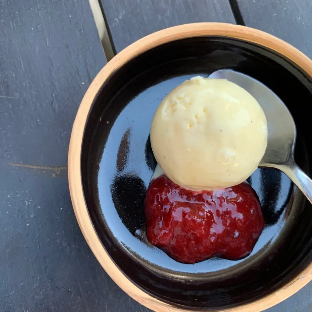 Fløden piskes let, og her menes let!! Fedtmolekylerne må ikke samles, det giver en grynet is. Man skal kunne skrive i toppen af den piskede fløde, men navnet skal forsvinde, hvis du ryster lidt med skålen. Æggeblommer, flormelis, sirup og vaniljekorn fra en halv vaniljestang piskes hvidt med en håndmixer – det tager et par minutter. Vaniljestangen gemmer du i en beholder fyldt med sukker – så har du en lækker vaniljesukker til en anden god gang! Fløden og æggemassen vendes forsigtigt sammen og fryses i de forme, du mener, der passer til anledningen. Isen ska være i fryseren i mindst 8 timer, før den kan serveres.