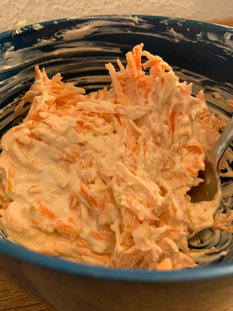 Du kan bruge alle typer rodfrugter – min favoritblanding er gulerod og persillerod ca. 1/1. Selleri og pastinak er også ok nice. Pas på med rødbede, lilla gulerod og andre rodfrugter, der kan farve dressingen. Bland rodfrugter og yoghurt med presset hvidløg. Rør rundt og smag til med salt og peber.